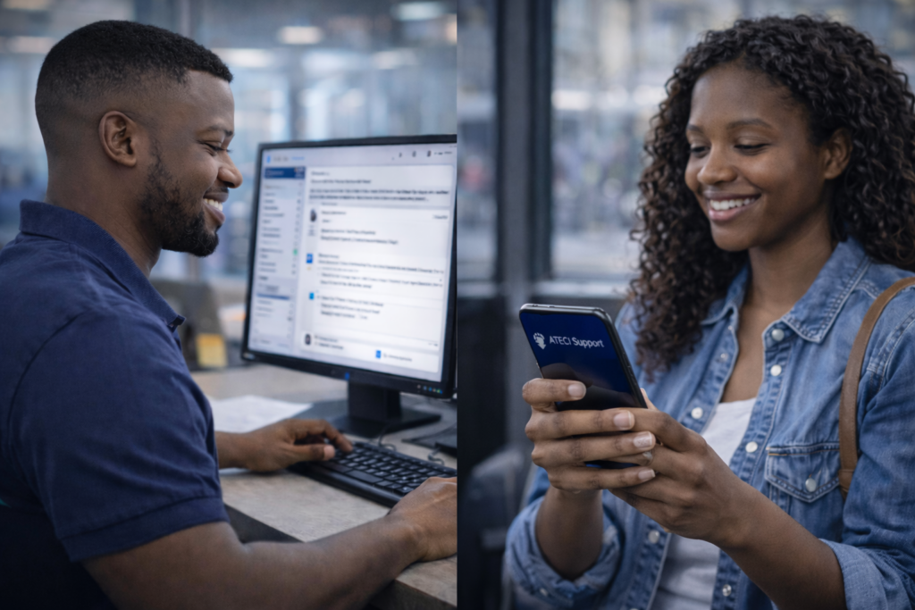 WhatsApp, chat web, email ou interface interne : ATECI Support centralise les demandes et assure une expérience cohérente, quel que soit le canal utilisé.